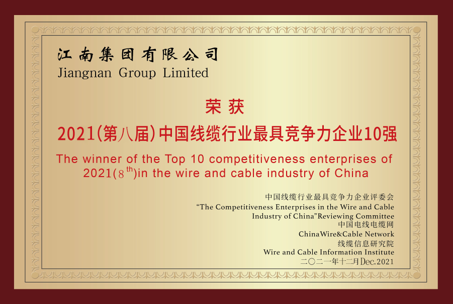 Jiangnan Cable won the Top 10 Building Electrical Brand Competitiveness in 2021!