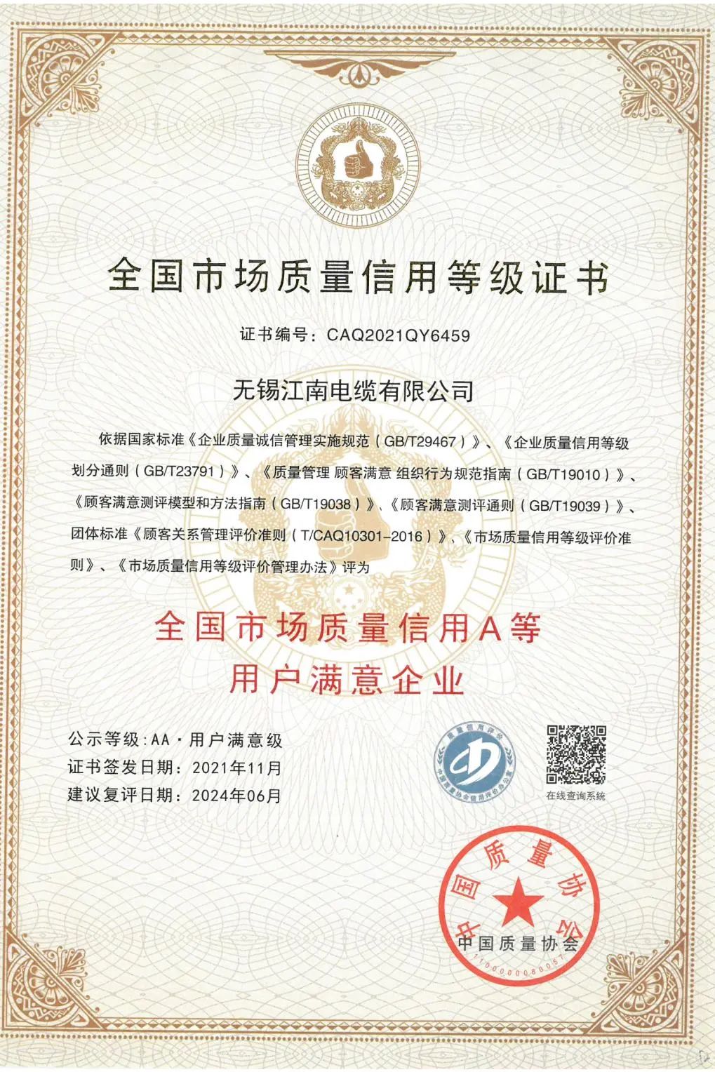 Brand is one of the important assets of anenterprise. Strengthening brand building and enhancing brand value are of greatsignificance to enhance the market competitiveness of enterprises. The 37 yeardevelopment of Jiangnan Cable has always take the concept of "excellentquality and win-win future", adhered to the value orientation of customerfirst, and closely focused on the values of "inclusiveness and focus,quality and integrity, pioneering and innovation, integration of intelligent manufacturing,and low-carbon ecology", committed to building the company into a domesticfirst-class and internationally renowned large enterprise group with innovativemanagement, advanced technology, and outstanding brand.